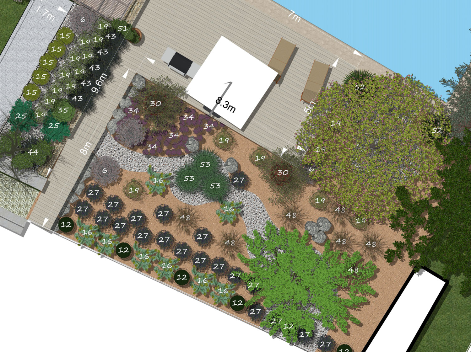 Un plan d’aménagement détaillé et clair de votre jardin, intégrant plantations, allées, terrasses et mobiliers.